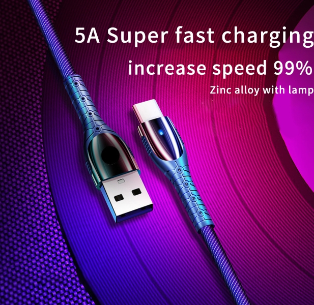 Cabo USB tipo C 5A LED para Huawei Xiaomi Samsung Cabo micro USB de carregamento rápido para iPhone Cabo carregador de celular Cabo de carregamento rápido de liga de zinco com luz